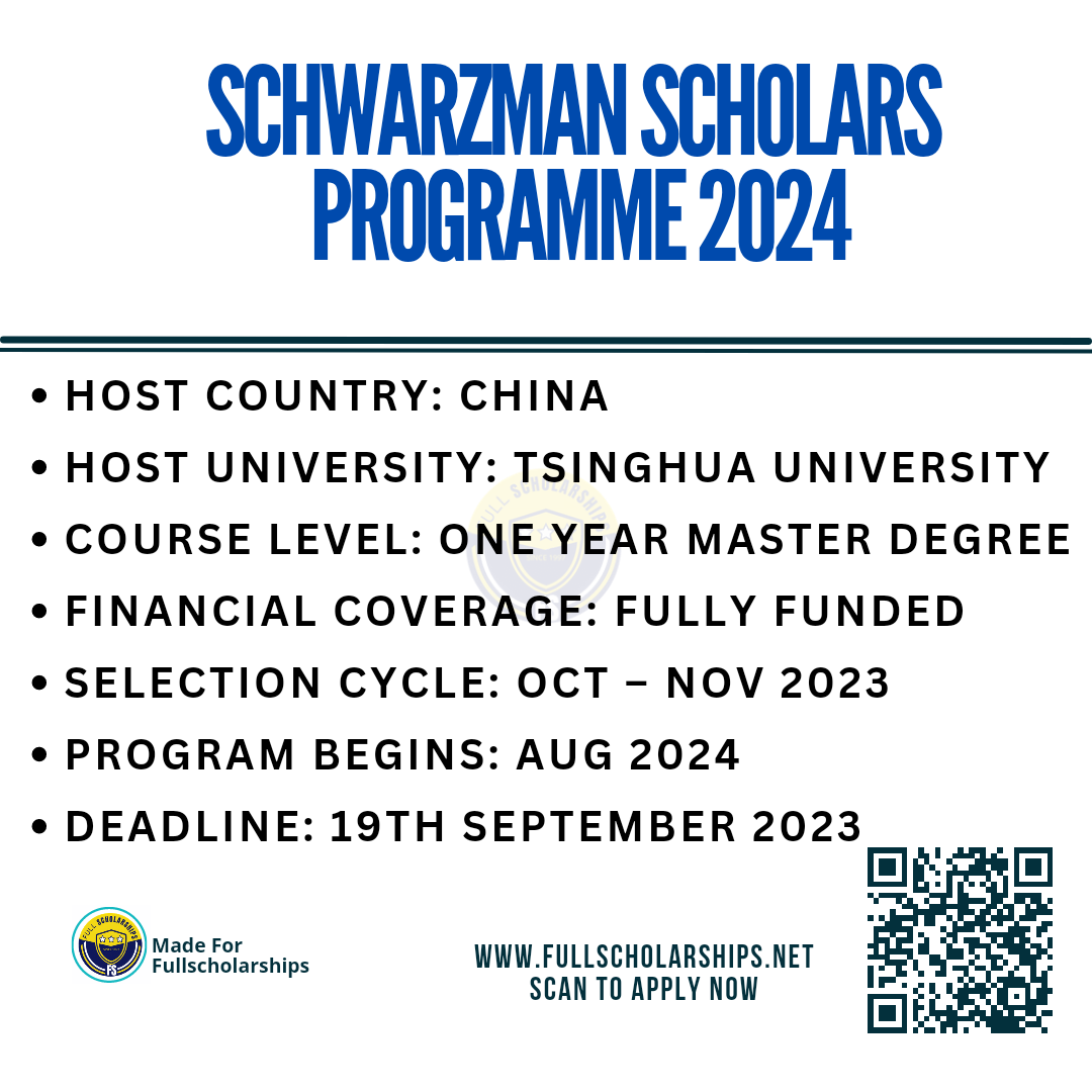 China's Most Popular Scholarship Program. The Schwarzman Scholars Programme 2024 in China is now accepting applications. The Schwarzman Scholarship is a one-year Master's Degree Scholarship at Tsinghua University in China. In 2024, around 200 Scholars will join. Every year, thousands of people from all around the world apply. The Schwarzman Scholarship is offered to students from all around the world.